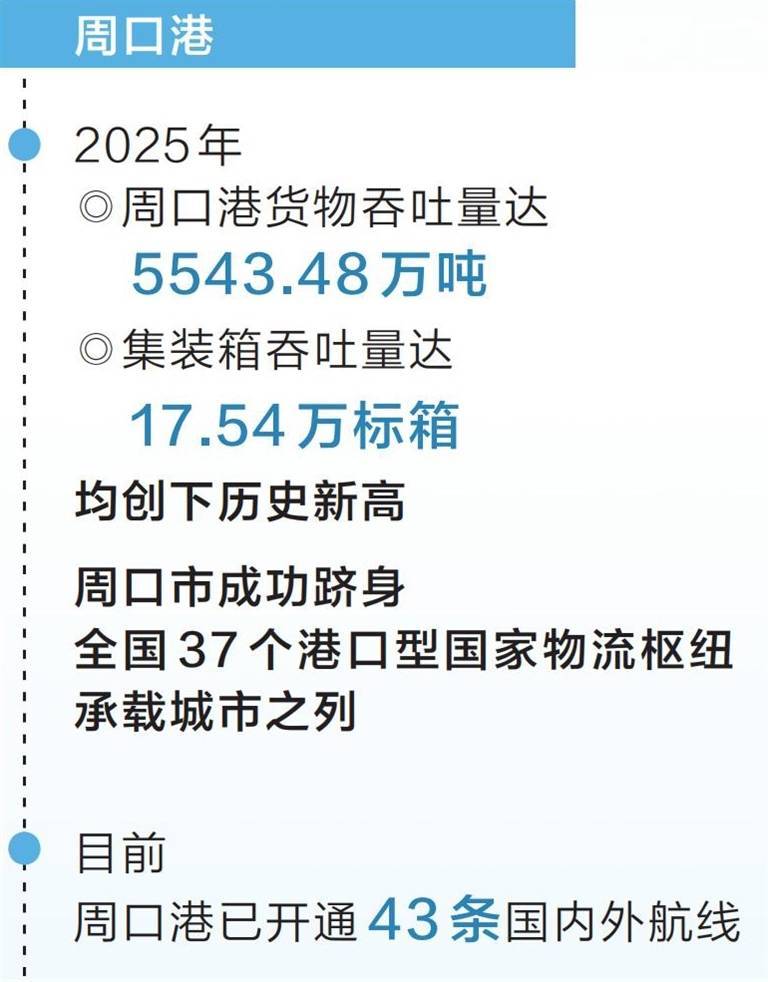 “数字见证着沙颍河航路的复兴。”于海涛介绍,目前,周口港已开通43条国内外航线,2025年货物吞吐量达5543.48万吨,集装箱吞吐量达17.54万标箱,均创下历史新高。