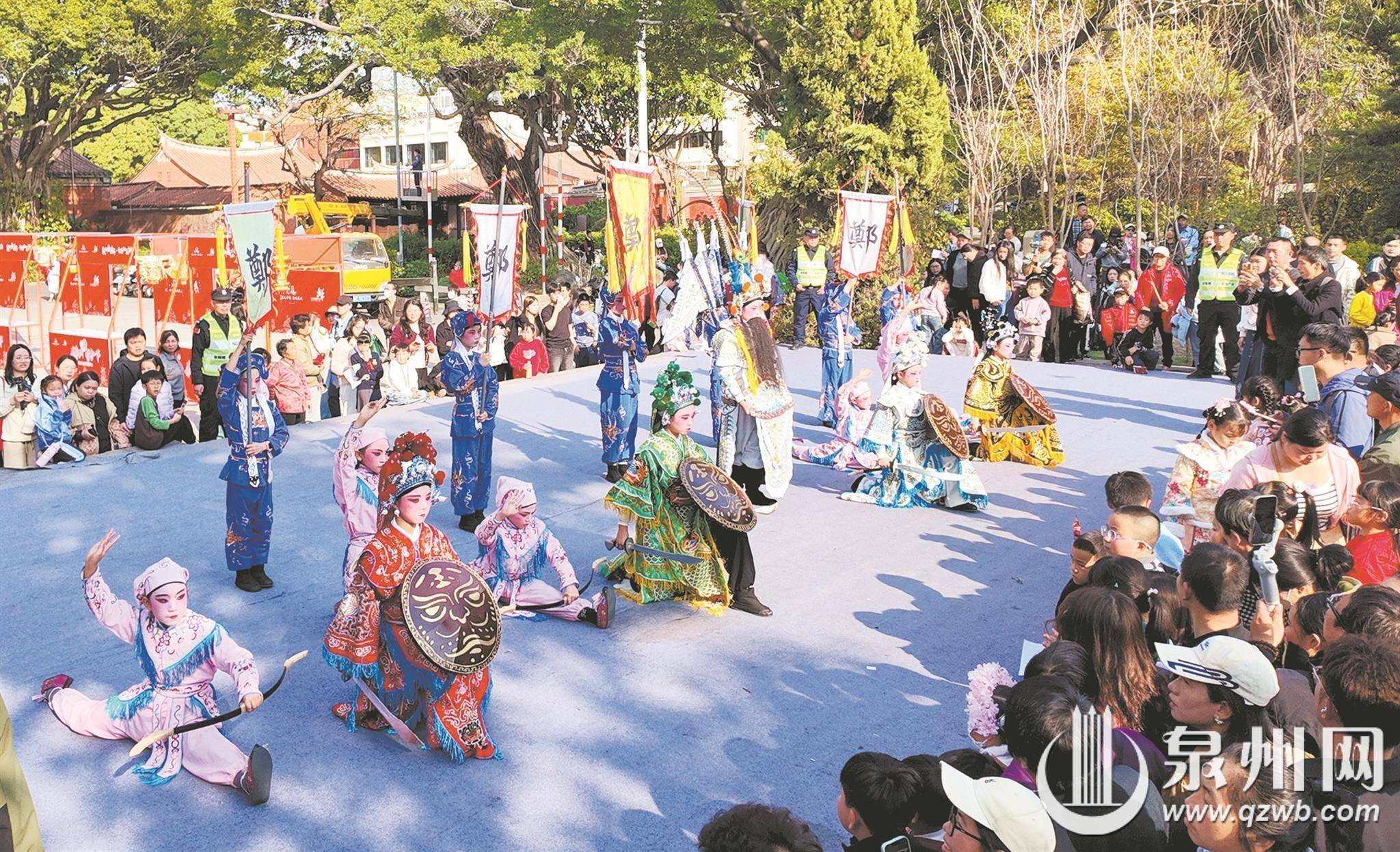 当天,泉州府文庙广场鼓乐齐鸣、人声鼎沸,“南安郑成功小高甲戏”热烈上演,演员们以灵动的唱念做打展现英雄史诗,吸引众多市民游客驻足,现场还免费发放周边限定贴纸。(东南早报融媒体记者张素萍 王柏峰 文/图)