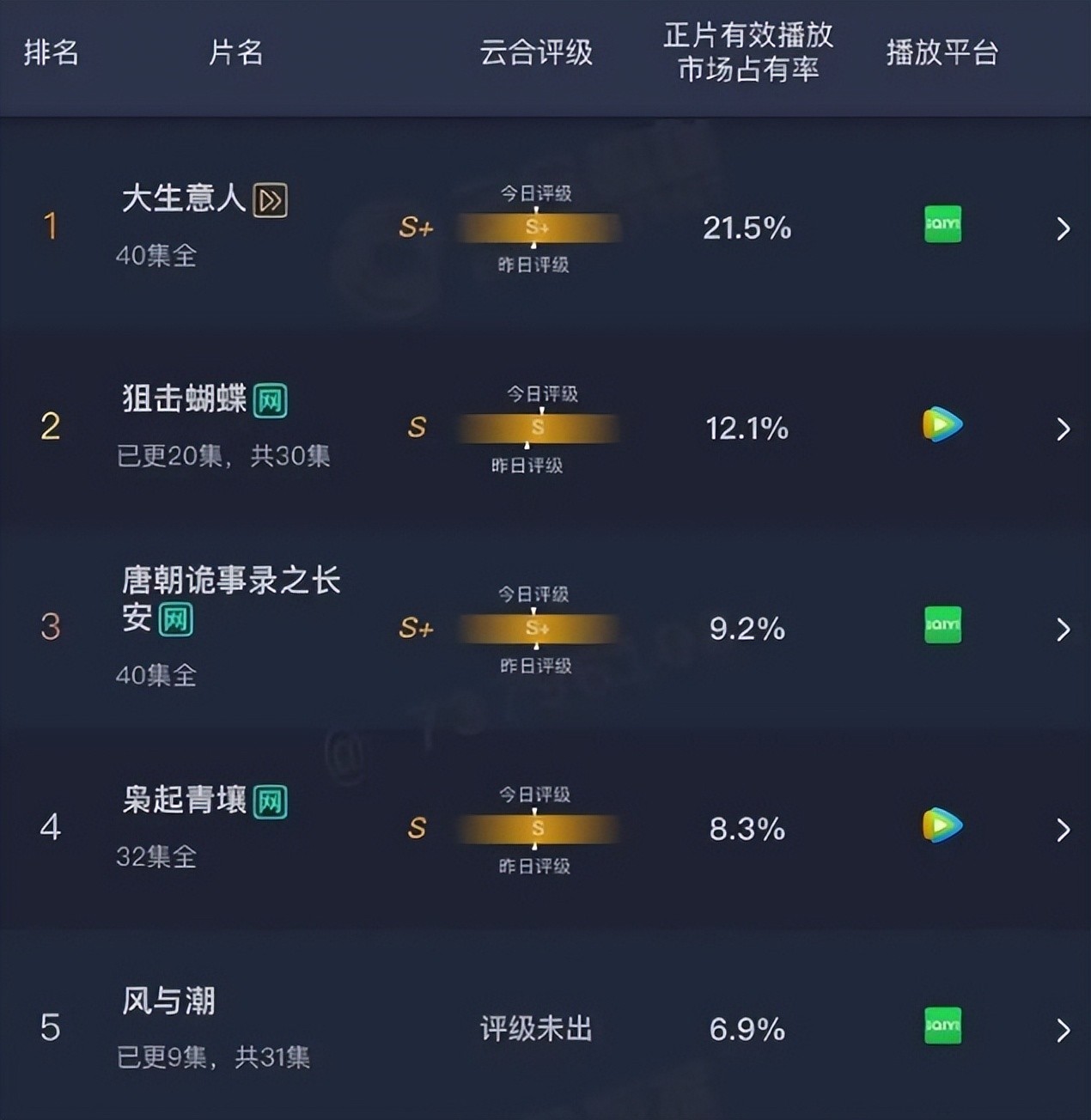 看到《大生意人》和《狙击蝴蝶》都开播之后,“陈晓陈妍希新剧对打”话题就登上热搜,然后,网友们就将这两部剧放在一起进行对比,从目前的情况上看,《大生意人的》云合正片有效播放市场占比为21.5%,但这部剧已经迎来大结局,如果不出意外,占比肯定会下降。