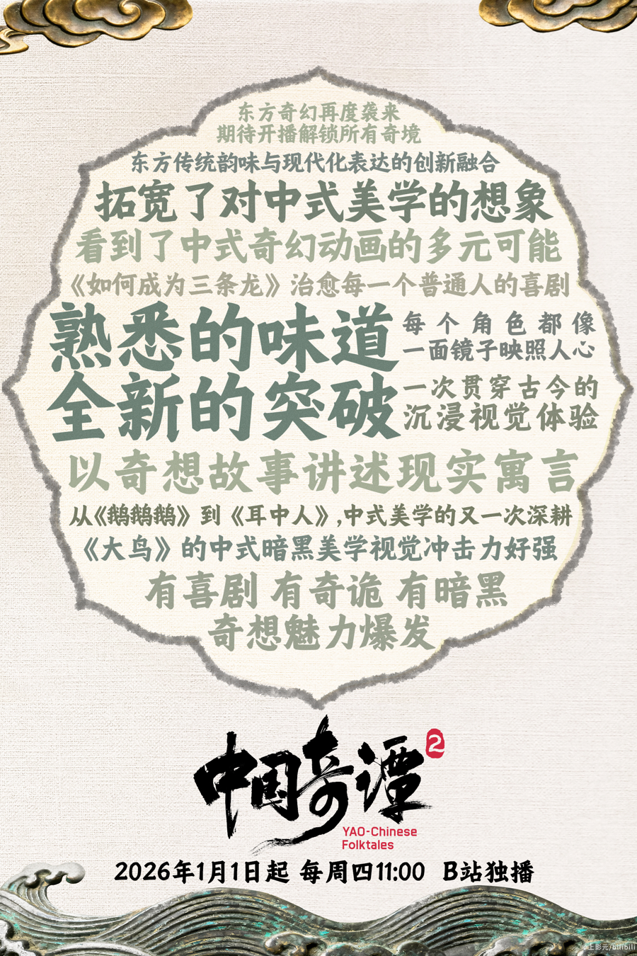 新年伊始,由上美影、上影元、哔哩哔哩与陈廖宇工作室联合出品的中式奇幻动画短片集《中国奇谭2》,于哔哩哔哩全网独家首播。作为备受瞩目的国创动画系列续作,《中国奇谭2》延续对东方美学的探索,以每周四11:00两部短片连播,开启全新篇章。这次,12位青年导演以九部风格各异的短片共同拓展“奇谭宇宙”的艺术表达边界,以中式奇想编织寓言故事,在东方美学里藏尽现实深意,为观众带来一场融合视觉享受与现实思考的开年文化盛宴。