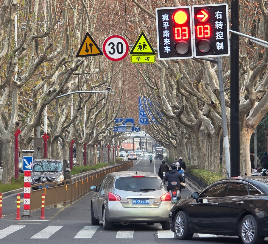 在衡山公园和徐家汇公园之间,有一个由衡山路、宛平路、广元路、建国西路交汇而成的六岔路口,这些路口信号灯相位多,而且部分道路是单行道,容易让初次开车到这里的司机朋友不知该看哪个信号灯,导致开错道。为此,在交管总队的支持和指导下,徐汇交管支队在路口信号灯旁边增设了来车方向路名电子辅助提示牌,配合信号灯通行指示,确保驾驶员“看得懂、搞得清、开对道”。这个措施并不复杂,却十分管用,很多司机反映,自从有了辅助标牌后,到了路口就一目了然,知道该看哪个信号灯、该往哪个方向去,也让整个路口的通行率明显上升。